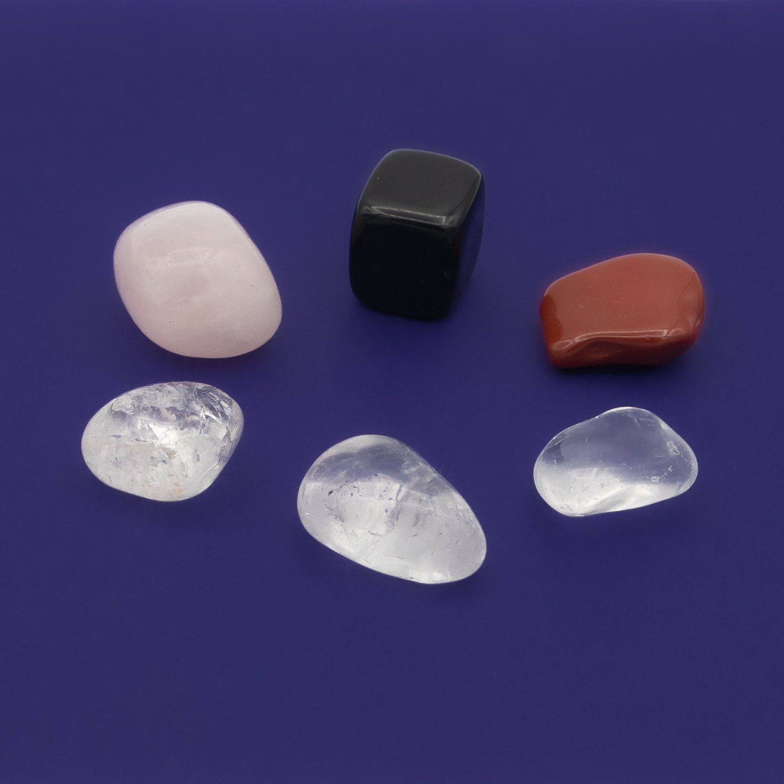 Each Energizing Gem Water Crystal Set includes x3 Clear Quartz, x1 Rose quartz Quartz, 1 Red Jasper, and 1 Obsidian Crystals
