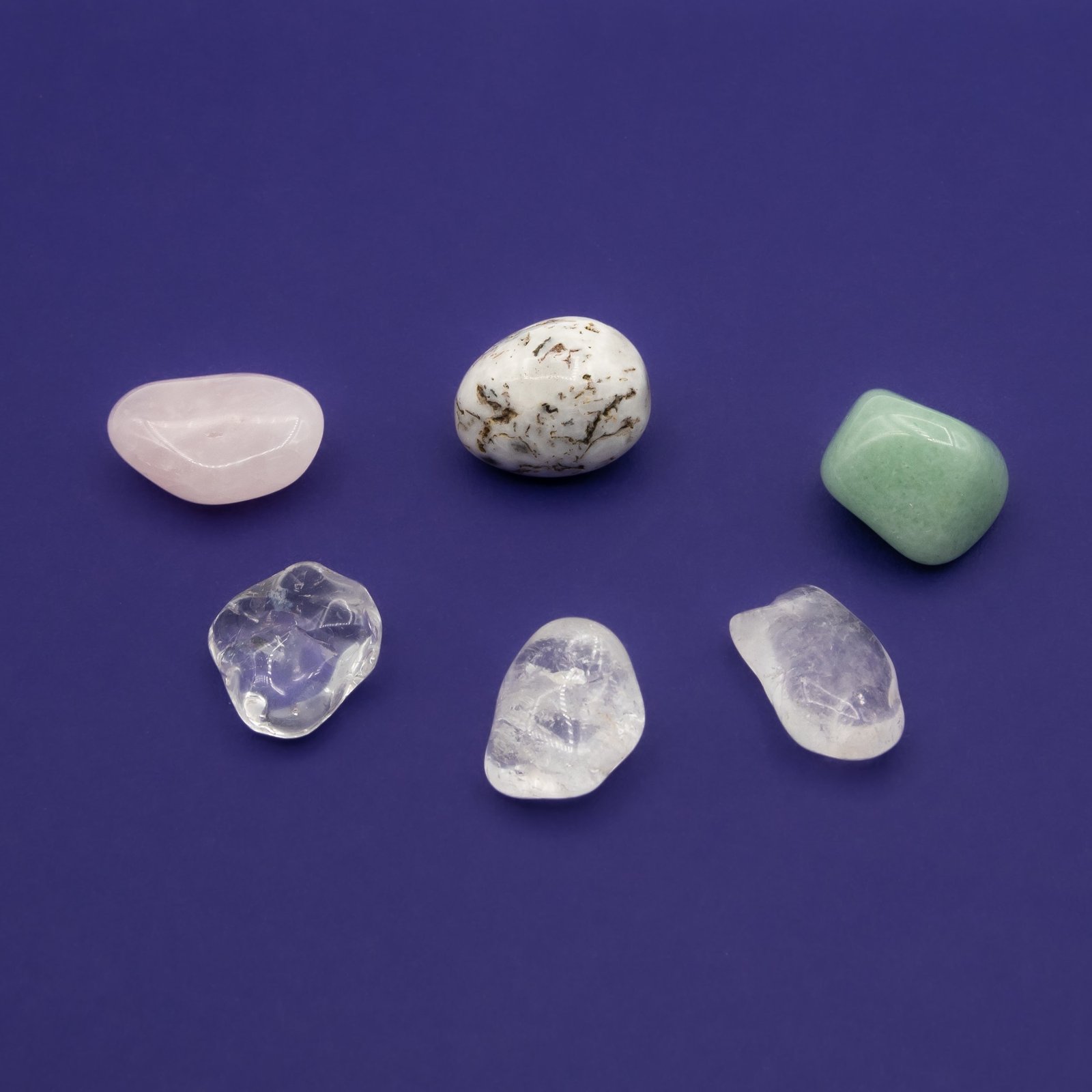 Each Be Well Gem Water Crystal Set includes x1 Green Aventurine, x1 Tree Agate x3 Clear Quartz and x1 Rose quartz Quartz Crystals