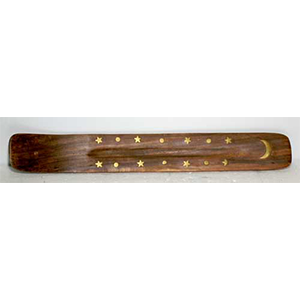 An elegant, yet function orientated design in wood with one end slightly angled as a holder for burning stick incense. 10-12”