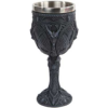 This cold Cast Resin chalice, wine goblet is a hand painted detailed design of a white wolf. 7 1/2 inches tall with a stainless steel cup that is non-removable.